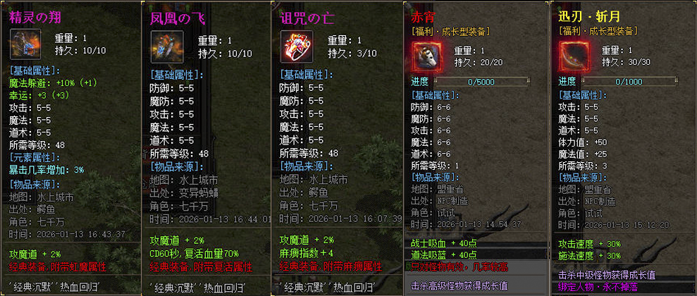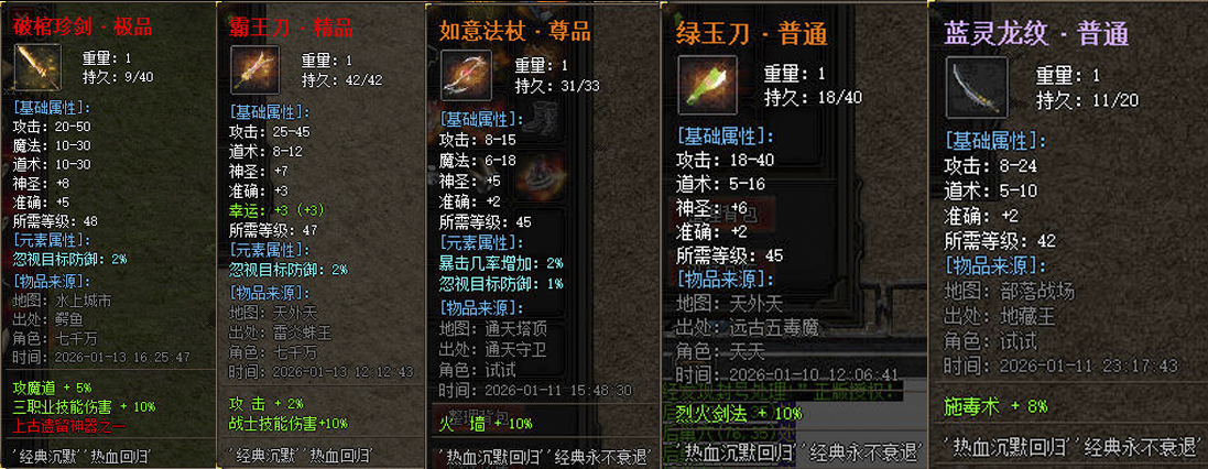穿戴鉴定:普通→极品→尊品→完美→传承。随机附加攻魔道、HP、MP、元素、倍攻等属性。